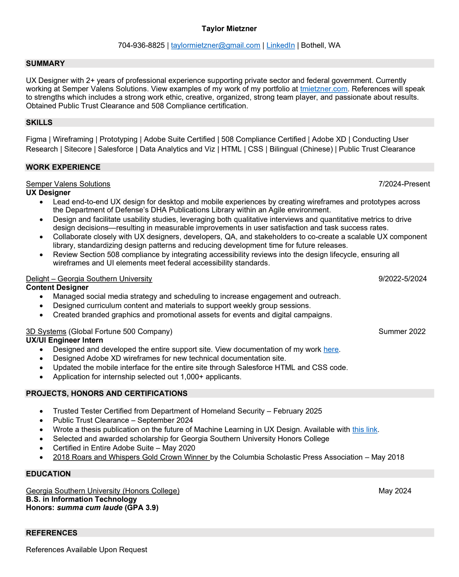 View My Resume This is an upload of my resume, which lists my work experience, accomplishments, and additional skills.If you wish to view the PDF document, click here.